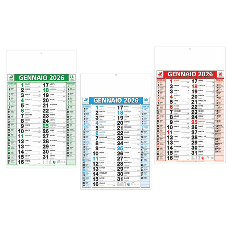 Calendario olandese classico. Trimestrale 12 fogli. Testata pressofusa. Carta patinata. Colori: blu, verde, rosso. Dimensioni: cm 28,8x47, testata cm 28,8x9,8.